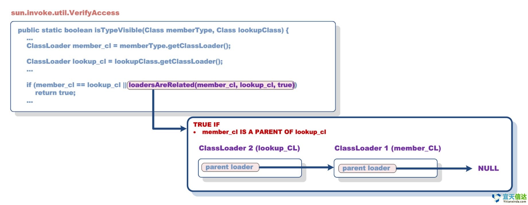 展現(xiàn)原始漏洞的(de)代碼樣例,→®•目标類的(de)ClassLoader并沒有(yǒu)進行(↔↔ £xíng)檢查;來(lái)源:Securi→γ±ty Explorations。Oracleγ§在2013年(nián)9月(yuè)提供了(le)一(yī βΩσ)個(gè)修正,作(zuò)為(wèi)Ja↕π ♠va 7u40的(de)一(yī)部分(λ←'fēn),包含了(le)類可(kě)見(jiàn)性的(≈₩©≤de)檢查,它會(huì)對(duì)比預期類型和(hé)傳入↕>♦類型的(de)ClassLoader,對(duì)比方式如(rú)下(xiα à):如(rú)果兩個(gè)ClassLoader相(α©₩xiàng)同的(de)話(huà),那(nà)麽按照¥€"(zhào)定義這(zhè)兩個(gè)類型是(shì)完全兼容的(de);