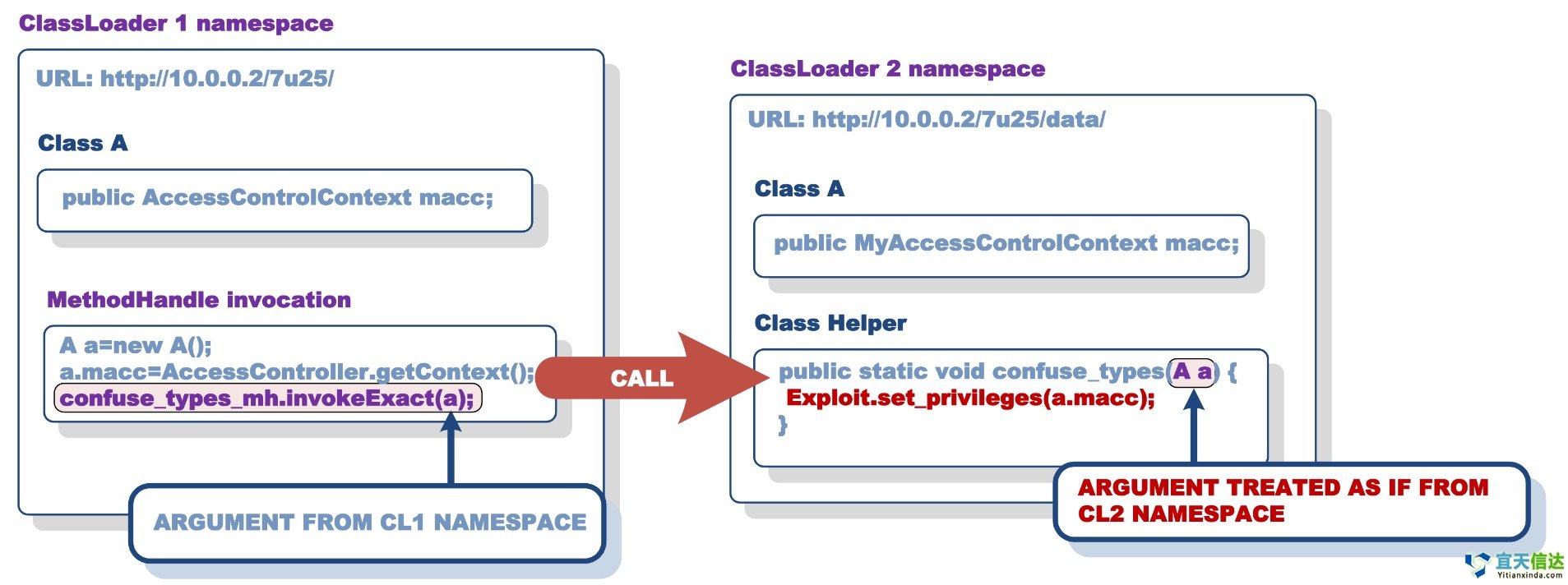 如(rú)果兩個(gè)不(bù)同的(de)類具有(y∞♣ǒu)相(xiàng)同的(de)類名和(hé)包名,但( •dàn)是(shì)由不(bù)同的(de)ClassLoader所÷♣♦加載的(de)話(huà),Java會(huì)認為(wè↕φi)它們是(shì)不(bù)相(xiàn≤ g)等的(de),在它們兩者之間(jiān)進行(xíng)賦值的←÷≤(de)話(huà),将會(huì)導緻ClassCastExcepti∏ ↑£on異常。這(zhè)樣的(de)話(huà),就(jiù)能(néng)保÷♣→Ω護環境免受類仿造的(de)攻擊。部分(fēn)修複以及由此導緻的(de)漏洞'☆Security Explorations較早報(×α ¥bào)告了(le)這(zhè)個(gè)漏洞,并将其歸類為(wèi)CVE-π&δ2013-5838,這(zhè)個(gè)漏洞可(k&♦ě)以描述為(wèi),當通(tōng)過Method Handle₽λ$調用(yòng)方法時(shí),對(duì)于被←©←調用(yòng)方法的(de)那(nà)個(gè)類,它的(de)C ↕★lassLoader并沒有(yǒu)進行δ•(xíng)檢查,這(zhè)意味著(zhe)攻擊者可(kě)以按照(π∏zhào)上(shàng)文(wén)所述的(de)方法進行(x∑σ¥íng)類的(de)仿造。