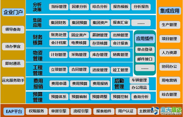 Ø 利用(yòng)EAP平台門(m≠¥γén)戶完成同平台的(de)客制(zhì)化(huà)開(kāi)發,快(φεkuài)速響應個(gè)性化(huà)需求↕ε。實現(xiàn)單體(tǐ)企業(yè)♦€§內(nèi)業(yè)務信息的(de)橫向集成,縱向貫通(tōng)。